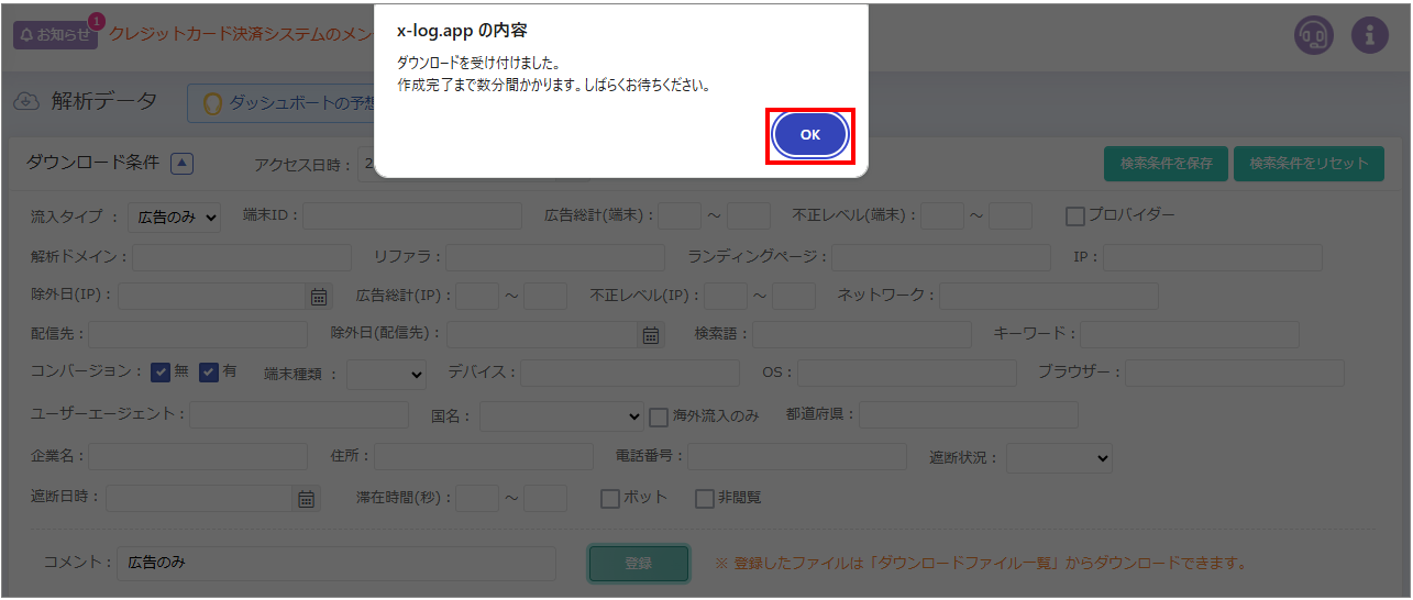 ※「コメント」欄に指定条件をを簡単に記載すると、後でダウンロードする際分かりやすくなります。